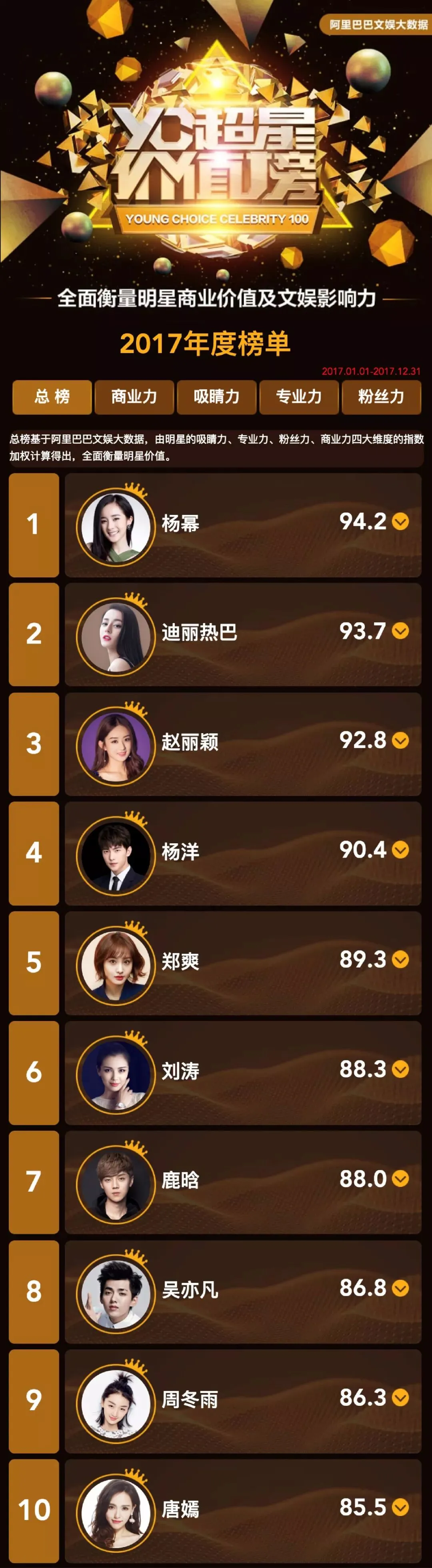 YC超星价值榜基于消费者对于明星的喜好和行为追随的分析研究,以阿里巴巴文娱大数据为基础,是一套可以用来全面衡量明星商业价值的评估体系。