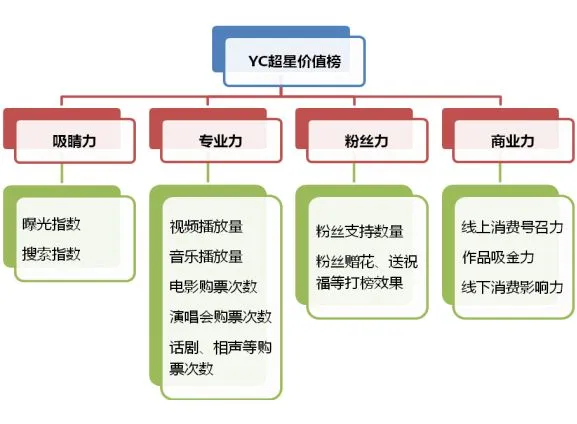 YC超星价值榜量化了明星在热度、专业能力、粉丝号召力和商业影响力这四个方面的表现,包括4项二级指标和12项三级指标,吸睛力、专业力、粉丝力和商业力构成了YC超星价值榜的主要评估架构。