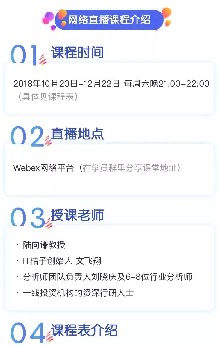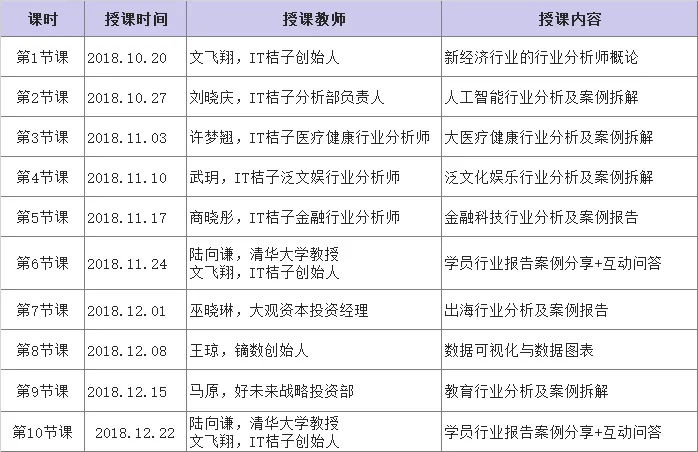 IT桔子联合清华大学陆向谦创新创业实验室,隆重推出为期10周的线上网络直播课程,以行业报告案例为出发点,每次2小时,深入浅出,系统讲解行业报告如何选题、收集素材、提纲框架、案例调研、写作、发布等,期待课程结束时、每位学员都能做出来一份属于自己的行业报告,具备行业分析师的基础素养和能力。