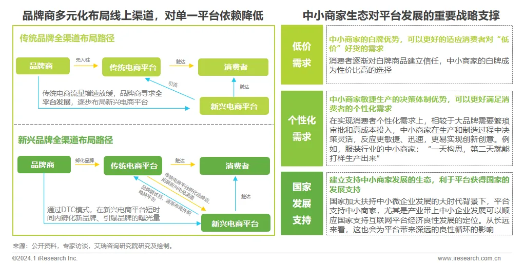 供给侧:1)“价格优势为王”:平台通过加大中小商家生态建设增强对价格优势的掌控力,以顺应物美价优者胜出的行业发展趋势;2)“服务体验为王”:存量市场竞争持续加剧,处于领先地位的电商平台通过半日达&送货上门等物流配送服务模式创新,抬高追赶者对其行业地位的挑战门槛。