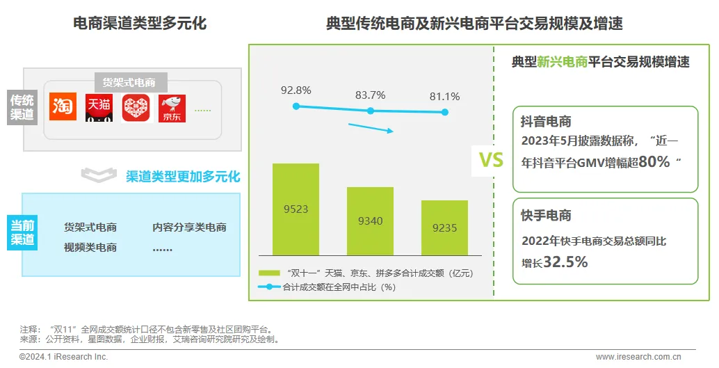 行业市场规模与格局:行业市场规模进入低增长高存量阶段,但电商行业依然不断涌入革新力量,这加速了行业运营模式的创新和行业格局演进进程。