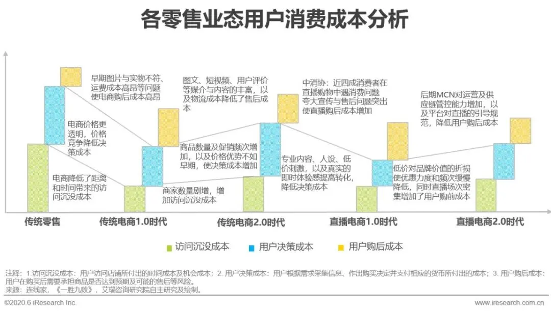 用户完成一次消费行为,要付出三项成本:访问沉没成本、用户决策成本与用户购后成本,前两者合称用户购前成本。直播电商未来的发展与传统电商有相似之处,传统电商后期由于购前成本增加,转化率下降,新兴模式如自营模式、社交电商、内容电商等得以兴起。
