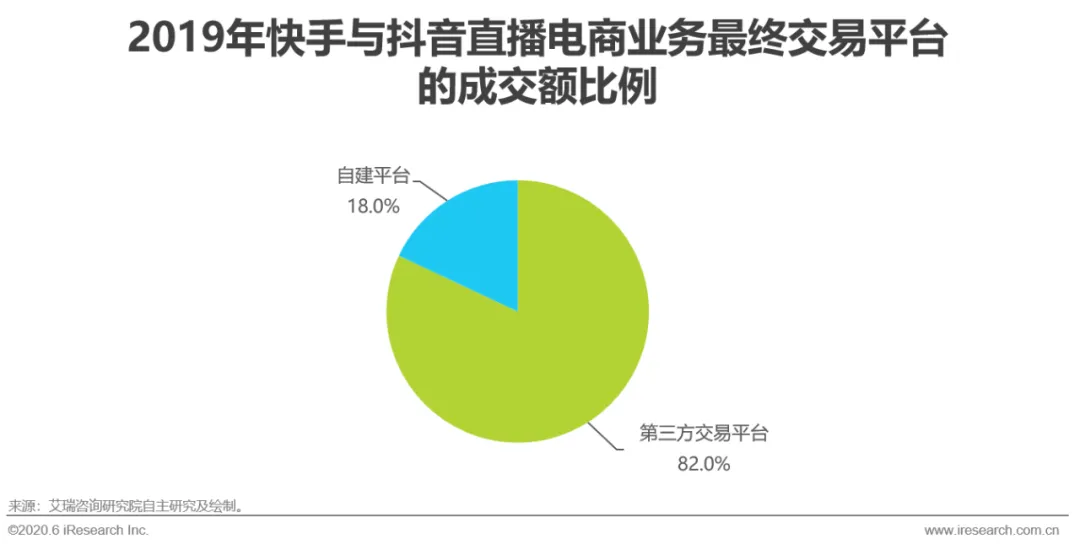 对于头部内容平台,虽然短期无法追齐同样的供应链服务与SKU管理,但是由于流量向更加可视化、碎片化的短视频类APP聚集,其作为流量资源的掌控方,与电商平台形成的互补价值是巨大的。因此艾瑞认为中长期双方的协同作用更大,合作模式仍较稳定,也会形成稳定的流量变现模式,目前抖音与快手两大内容平台上自建平台的直播带货成交额占比18%,预计这一比例会处于稳定缓慢增长的趋势。