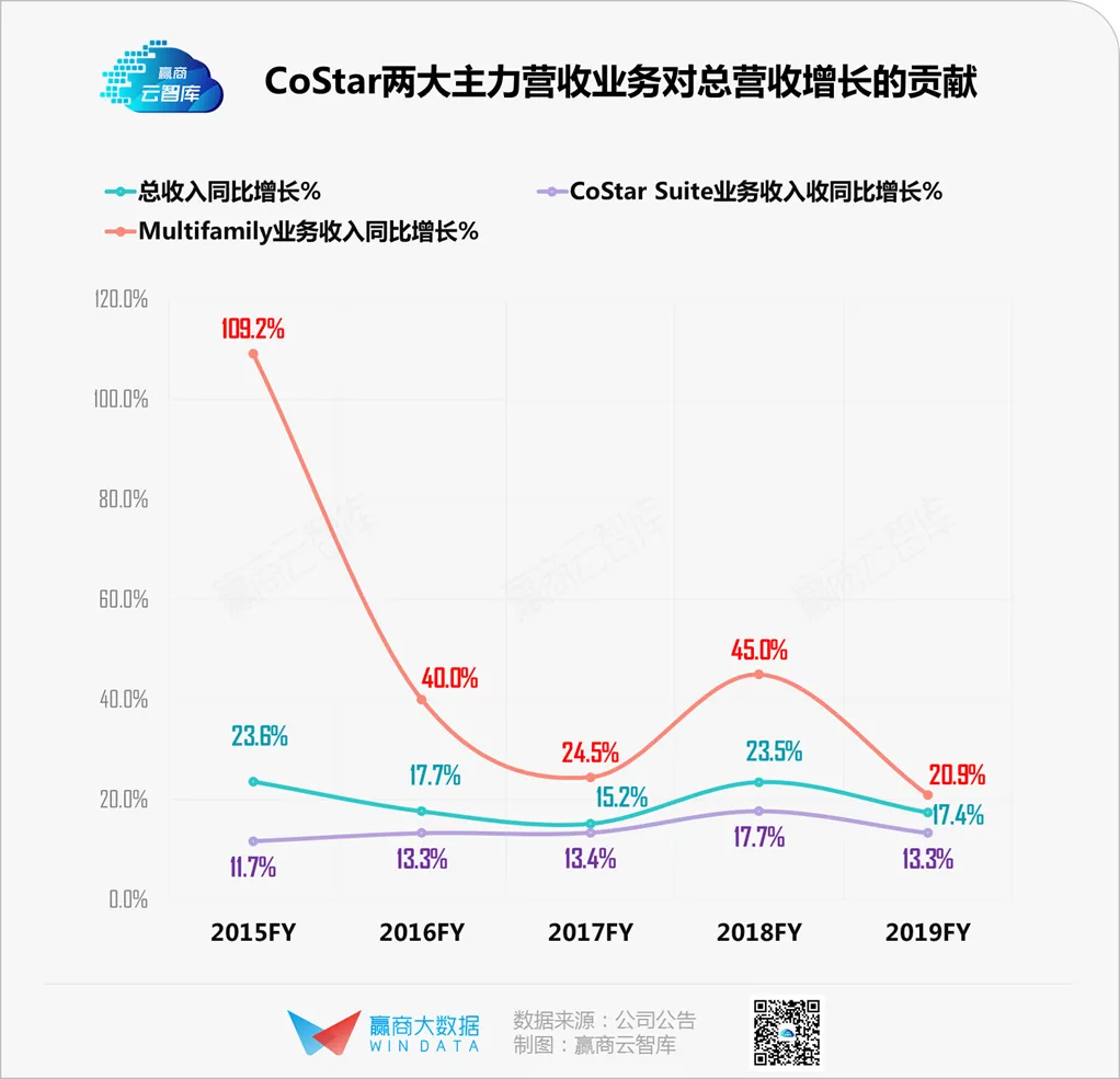 但拆分来看,会发现:CoStar Suite是CoStar现金奶牛,2014-2019财年营收占公司总营收的比重均值为49%,年均复合增长率达13.87%。