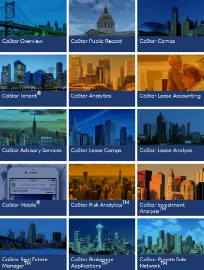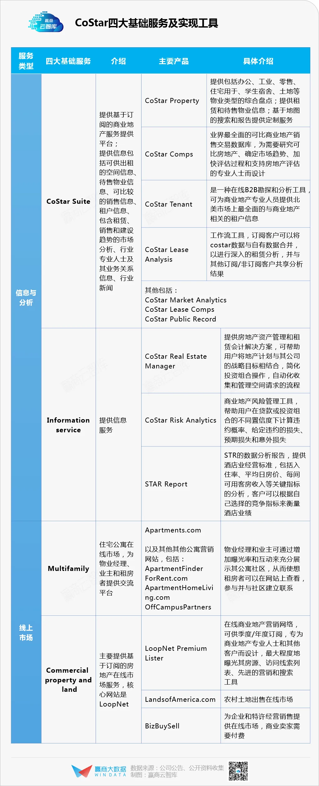 CoStar Suite是一个服务提供平台,立足于专有信息数据库,主要通过CoStar Property、CoStar Comps、CoStar Tenant等产品为用户提供可订阅的商业地产相关信息与分析服务。