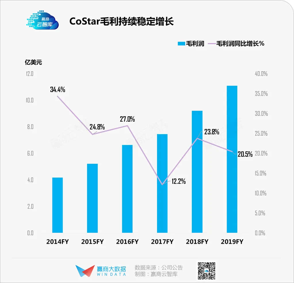 通过不断优化收入结构,2014-2019财年CoStar营收增长进入快车道,按年增速均保持在两位数以上,分别为30.61%、23.61%、17.70%、15.16%、23.52%、17.45%,高于营业成本增速,毛利稳定上扬。