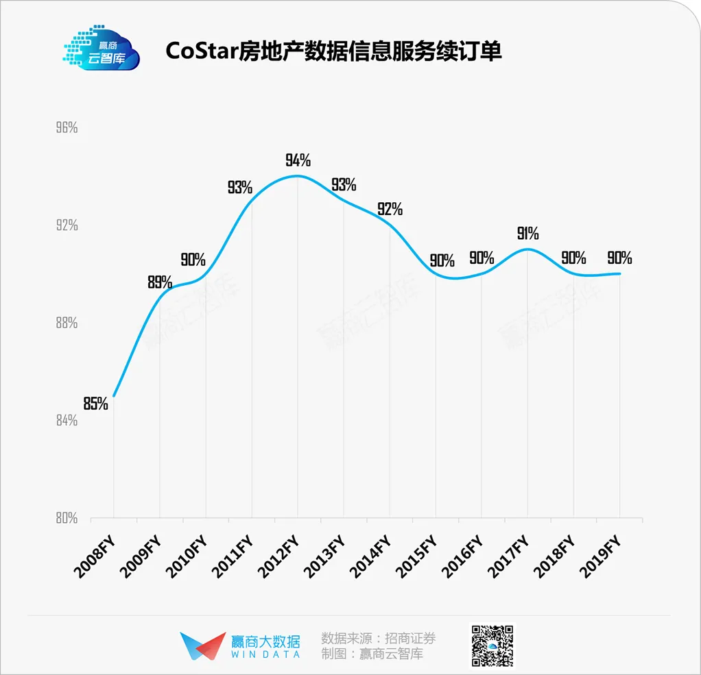 在数据、研究、营销、服务合力下,CoStar形成了极高的留客能力,以及订阅服务合同续签率。