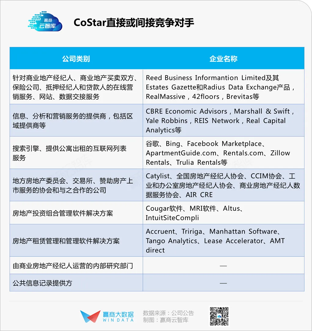 Bloomberg拥有强大数据资源,已宣布有意进军商业房地产信息业务的公司;Google有广泛的网络影响力和强大的数据聚合功能,可进入在线商业房地产营销领域;Zillow已在住宅房地产和公寓租赁行业占一席之地,可利用其资源进一步扩大在线公寓租赁……