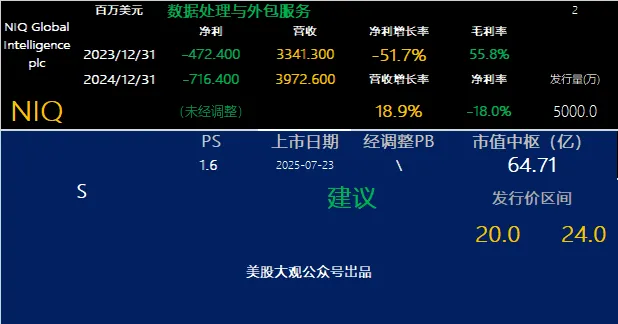本次募资11亿美元,IPO估值65亿约合1.6x的2024年市销率。过去3年亏损分别是3.16亿/4.72亿/7.16亿。美股对亏损但是增速较高科技公司普遍有非常高的容忍度。不过公司2025Q1的增长仅0.4%,有明显的下滑,后续的增长预期仍然需要提高。https://nielseniq.com/global/en/