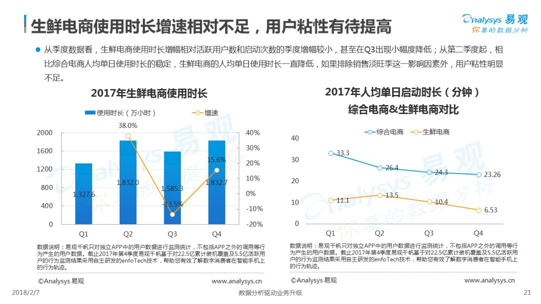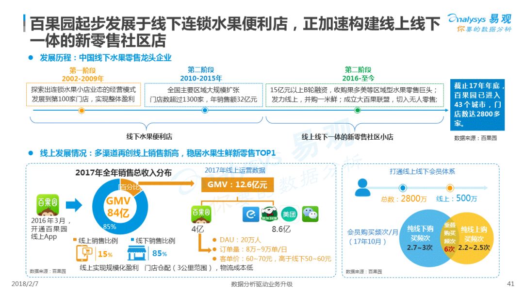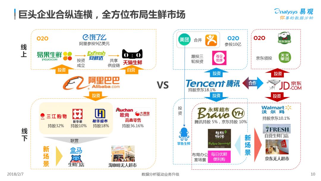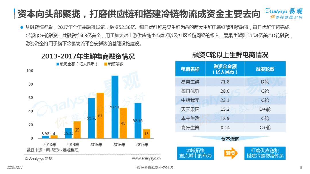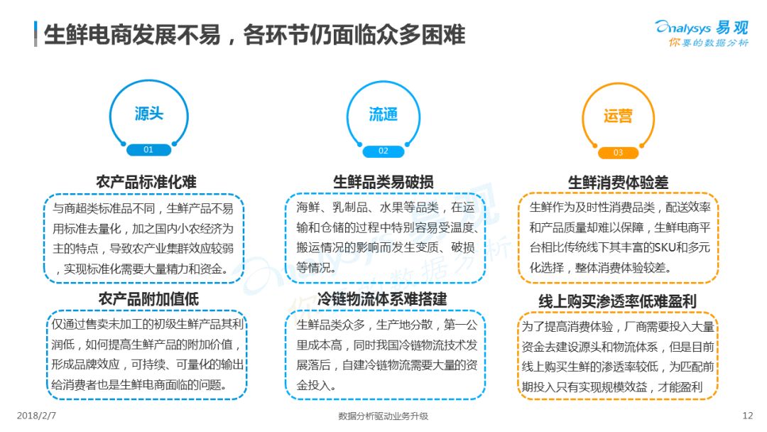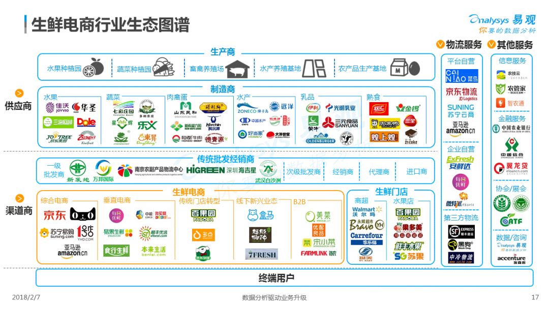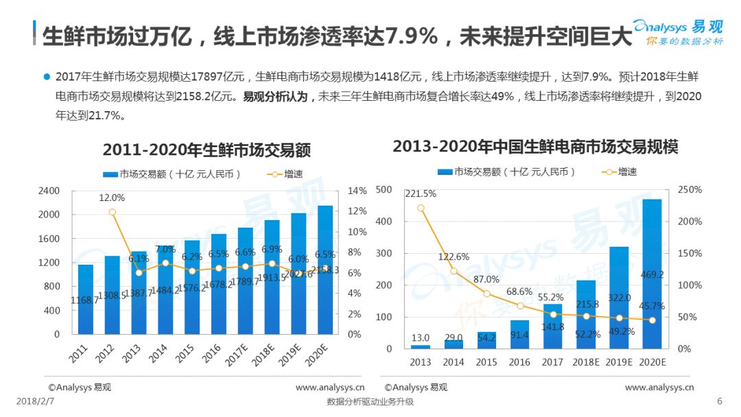 2017年,生鲜电商借“新零售”的东风再次被点燃,已经发展了15年并且有万亿市场商机的生鲜电商,线上渗透率仍不足10%。在市场投资收紧并向头部聚拢的环境下,存活下来的生鲜电商发挥自身优势,寻求不同发展路径,巨头企业探索渗透线下市场,新兴厂商精细化运营谋求出路。