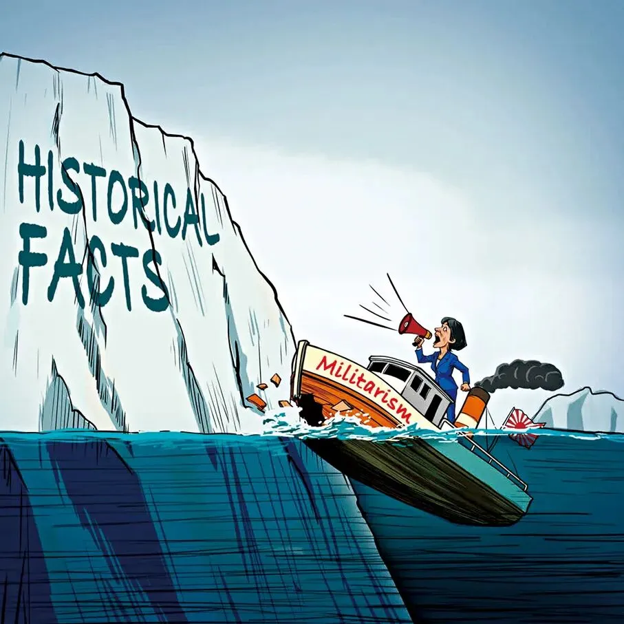 漫畫:當軍國主義的小船企圖衝撞歷史真相的大山。新華社