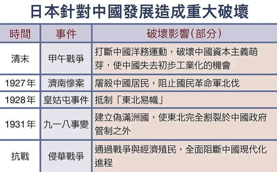 劉江永認為,日本對外侵略的行為還與其國內政治、階級矛盾和經濟危機密切相關。例如,1929年日本經濟大蕭條時,日本國內階級矛盾激化,於是軍國主義日本便通過對外侵略,將國內的「階級矛盾」轉化為「民族矛盾」,並利用天皇制和「受害意識」獲得國內民眾與輿論的狂熱支持。劉江永同時認為,日本的擴張本能與所處地緣條件不無關聯,特別是甲午戰爭後日本的一系列侵華戰爭,曾嚴重打斷或改變了中國的發展進程(見中表)。