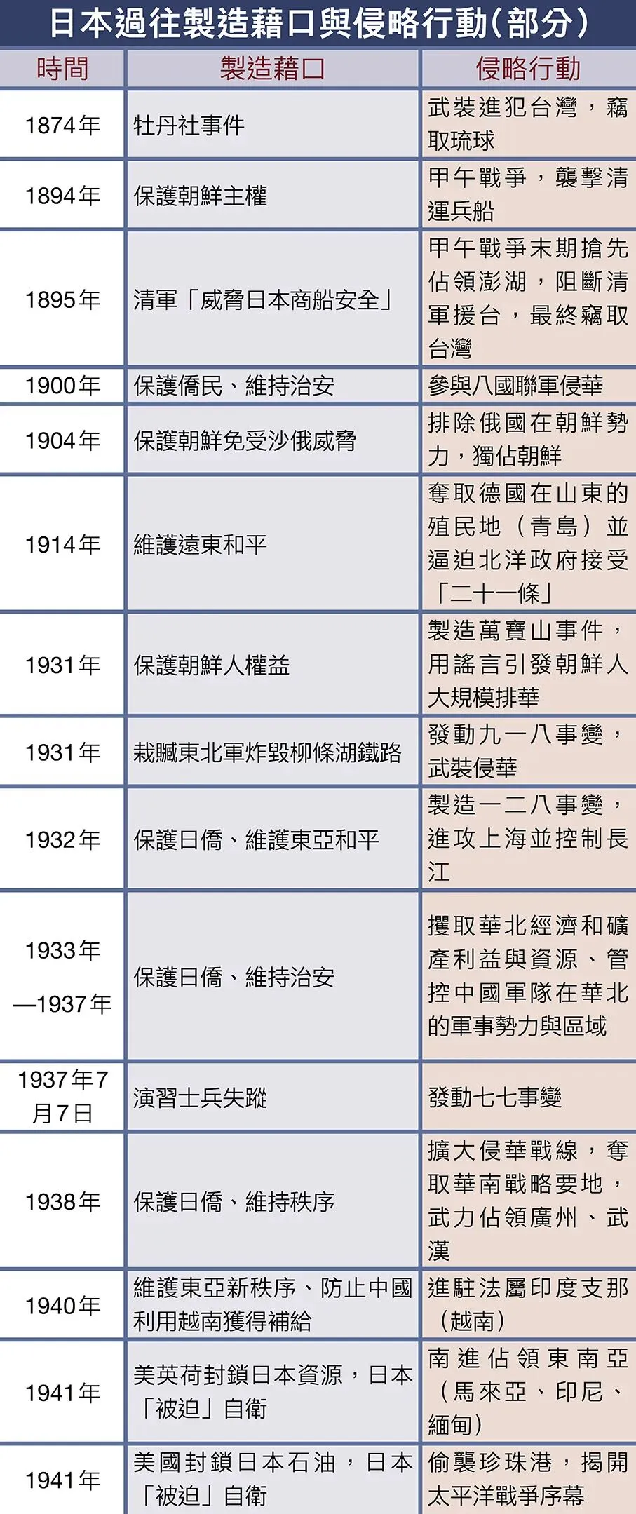 自唐朝白江口之戰,日本首次以國家名義與中國開戰,至1945年二戰戰敗投降,在長達約1,300年的歷史中,日本多次因自身擴張本能和地緣結構對中國發動侵略。清華大學國際關係學系教授劉江永指出,日本對華侵略行動帶有某些規律性。其與「中國國運、國家轉折點」高度相關。「可以說,歷史上的日本對華侵略擴張是有預謀、有準備的,既有間歇性也有延續性。在這一過程中,日本有時就像中場休息,以利積攢實力,準備向中國發起致命一擊。」(見下表)