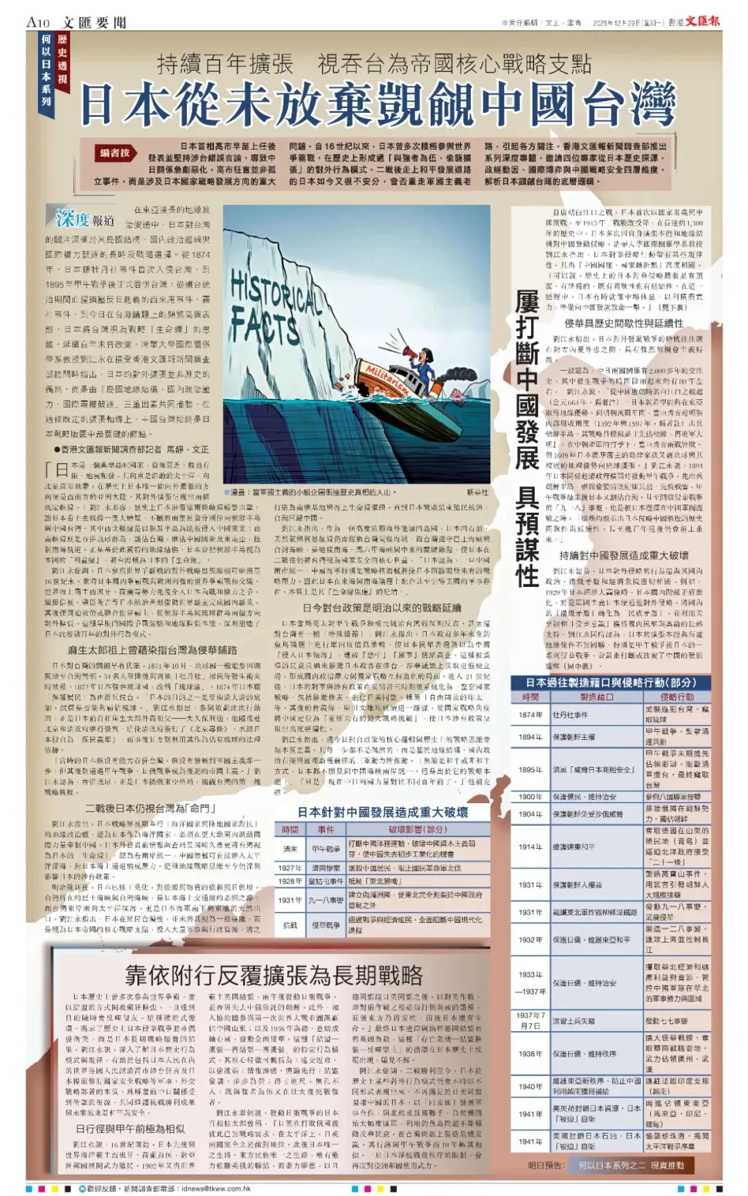 在東亞漫長的地緣政治變遷中,日本對台灣的關注深植於其島國結構、國內政治邏輯與國際權力競逐的長時段戰略選擇。從1874年,日本藉牡丹社事件首次入侵台灣,到1895年甲午戰爭後正式吞併台灣;從殖台統治期間血腥鎮壓反日起義的西來庵事件、霧社事件,到今日在台海議題上的頻繁高調表態,日本將台灣視為戰略「生命線」的思維,延續百年未曾改變。清華大學國際關係學系教授劉江永在接受香港文匯報新聞調查部訪問時指出,日本的對外擴張並非歷史的偶然,而是由「島國地緣結構、國內政治壓力、國際霸權競逐」三重因素共同推動。在這條既定的擴張軸線上,中國台灣始終是日本戰略版圖中最關鍵的節點。