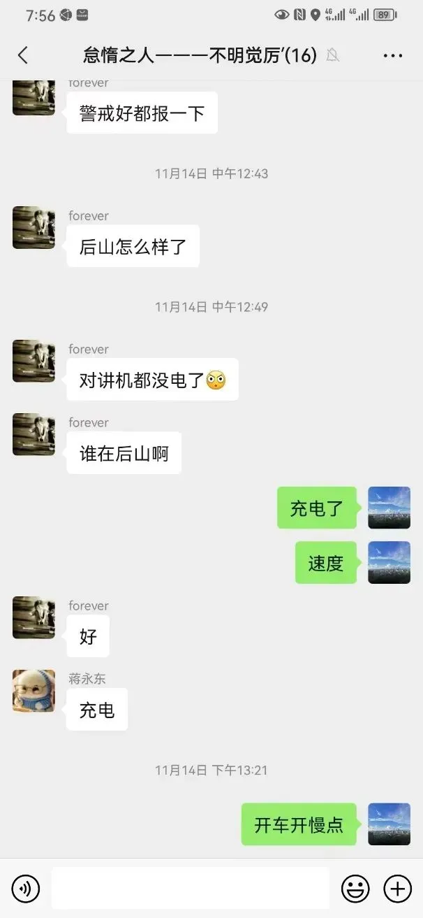 警戒期间, 在二期山头东面的爆破技术员蒋永春在微信群里讲:“对讲机没电了”“谁在后山”,安全员在核对二期山头东面各个警戒区域完成警戒后,在微信群里回复:“充电了”(“充电”是给起爆器充电)“速度”,蒋永春回复:“好”。