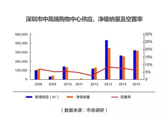 2015年,中高端购物中心供应量与净吸纳量持平,平均空置率约6.2%,核心及新兴商圈的控制率分化持续扩大,核心商圈的平均空置率同比上升0.7%至7.8%,新兴商圈的平均空置率同比下降4.6%至2.5%。