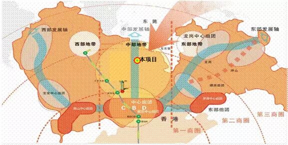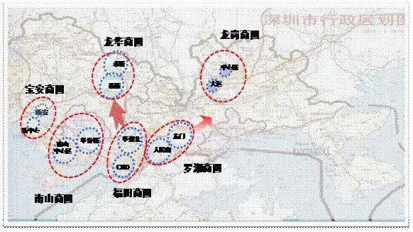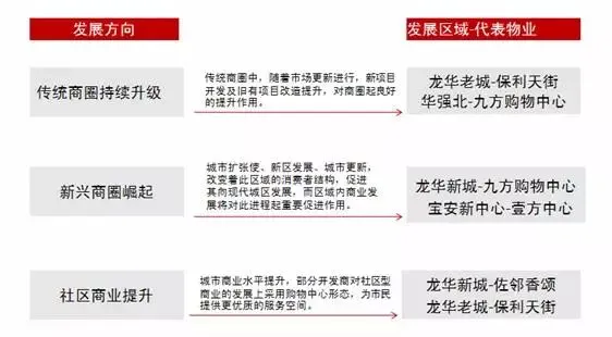 随着东西走向的饱和发展,商业中心开始逐渐向北带状衍生,形成宝安、龙华、龙岗三大新兴商业组团。