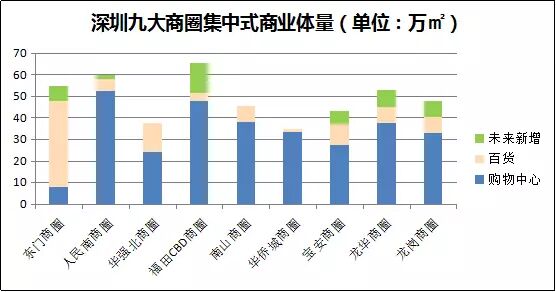 2、购物中心型商业主要集中于人民南、CBD商圈,其次是龙华、南山等商圈,百货型商业主要集中于东门及华强北,未来新增集中型商业主要位于CBD及龙华商圈。