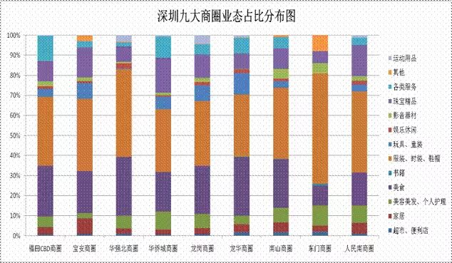 1、深圳九大商圈主要业态服饰等零售业态平均占比36%;