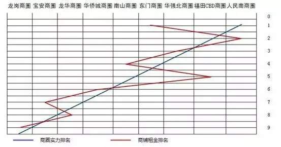 投资性价比低的商圈:东门商圈、南山商圈、华侨城商圈、宝安商圈、龙岗商圈的租金排名高于其商圈实力排名,投资性价比低。