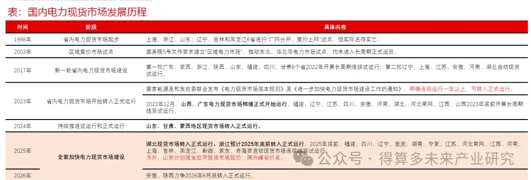 国内电力现货市场发展历经多阶段探索,2025-2026进入全面加快建设阶段。1998 年启动省内试点但未实质落地,2003 年推进区域试点亦未长期运营;2017 年开启新一轮省内建设,经多年试运行,2023-2024年山西、广东、山东、甘肃、蒙西地区现货市场陆续转入正式运行。2025年4月,国家发改委、能源局联合发布《关于全面加快电力现货市场建设工作的通知》,标志着国内电力市场改革进入新阶段,明确要求大部分省份2025年底前启动现货市场连续结算试运行,按照《电力现货市场基本规则》连续运行一年以上可转入正式运行,因此2026年国内大部分省份将实现现货市场正式运行。连续结算试运行后,储能将可持续参与现货市场套利。