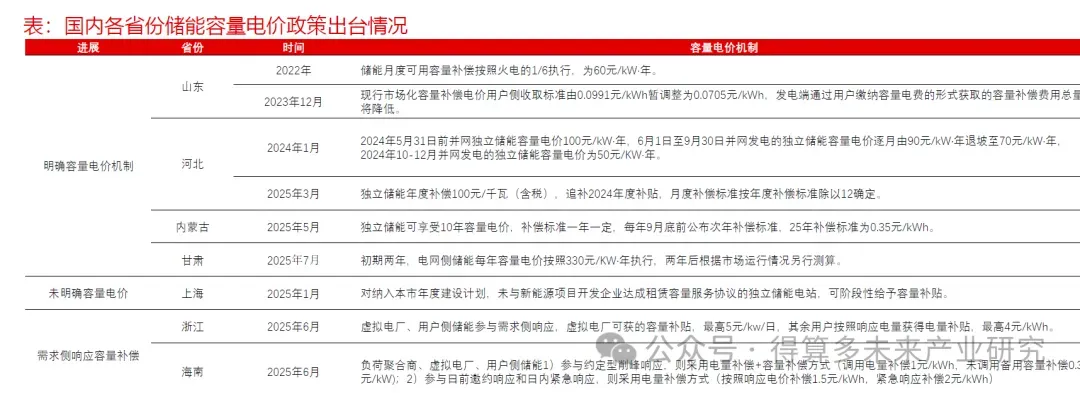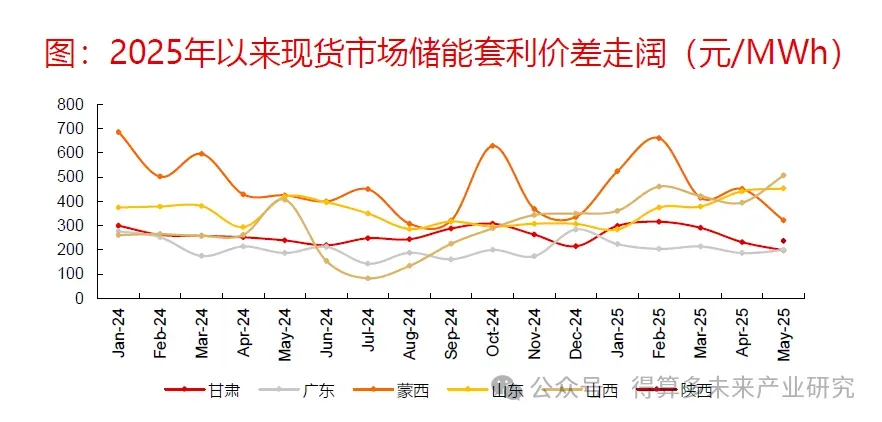 另外,随新能源市场化比例提升,现货市场价差有望进一步扩大。2025年1-5月甘肃、广东、蒙西、山东、山西5个进入现货市场的省份,现货市场价差均同比扩大,其中蒙西、山西平均现货价差达到0.4元/kWh以上。在政策上,2025年5月山东发改委印发《山东省新能源上网电价市场化改革实施方案(征求意见稿)》提出适当放开现货市场限价,拉大充放电价差;内蒙亦有相关政策出台,现货市场价差有望进一步扩大。