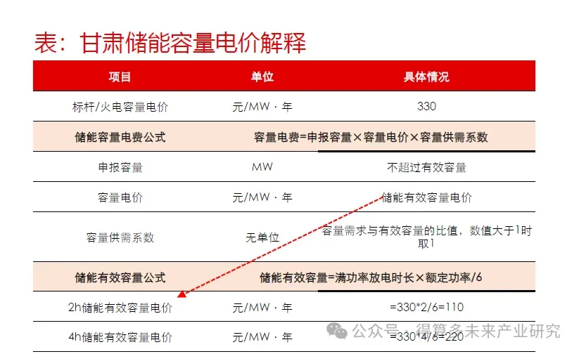 ➢ 容量电价:甘肃储能容量电价计费方式为:容量电费=申报容量×容量电价×容量供需系数;其中申报容量不超过有效容量,储能有效容量=满功率放电时长×额定功率/6;其中容量功率系数为容量需求与有效容量的比值,数值大于1时取1。