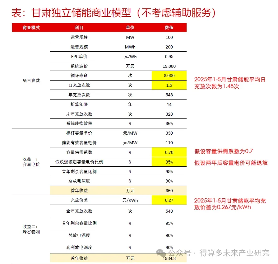 ➢ 模型假设:1-5月甘肃储能现货套利价差平均0.27元/kWh、平均日充放电次数为1.48次,保守考虑EPC成本0.95元/Wh,转换效率86%、首年衰减5%、充放深度90%。