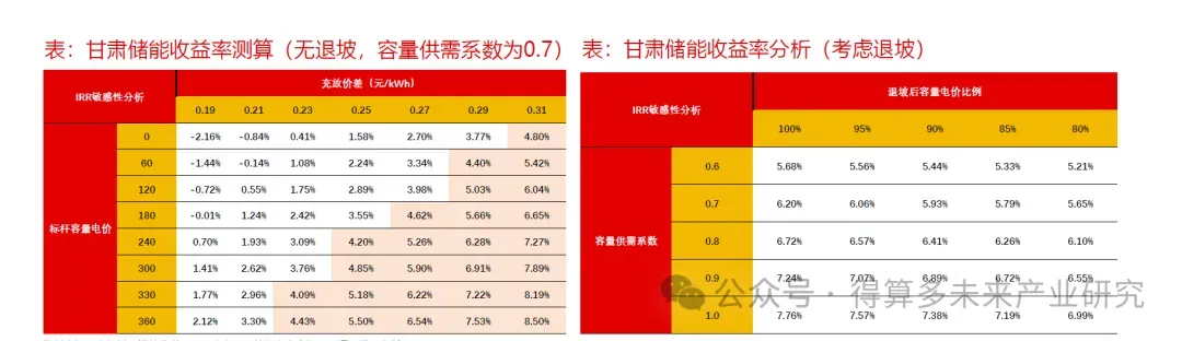 ➢ 测算来看,假设容量若容量供需系数为0.7,若电价维持10年、两年后不退坡,仅靠现货市场套利全投资收益率为2.7%左右,叠加容量电价,全投资收益率提升至6.22%,考虑甘肃调频辅助服务收益,贷款投资收益率预计更高。