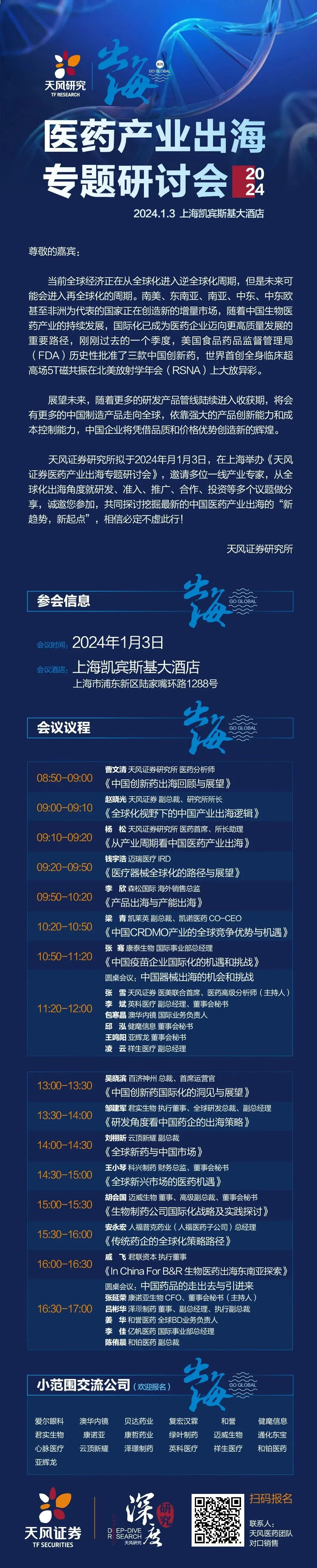 新年之际,天风证券再次奋发向上,深度聚焦,将于2024年1月3日在上海举办医药产业出海专题研讨会,邀请广大投资者共话医药产业出海的投资机遇!