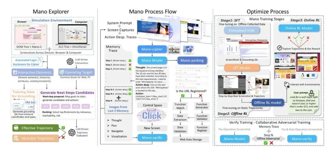 思考与决策需要最终落地。Mano模型正是DeepMiner的自动化执行者,负责将策略蓝图转化为现实世界的具体操作。它让智能体真正具备了与环境交互的能力,能够在各类软件及浏览器环境中实现精细化的自动化操作,如获取数据、填写报表、发布内容等。其核心技术在于通过强化学习,自主探索并适应全新的平台与业务流程。