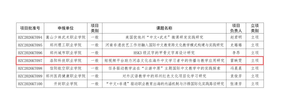 近日,从河南省教育厅传来喜讯,由洛阳科技职业学院教师雷映雯主持申报的《短视频平台助力河洛文化在海外中文学习者中的传播与教学应用研究》项目,成功获批2026年河南省国际中文教育研究与实践课题。这不仅是洛科国际化办学征程中的一个新的里程碑,也标志着学校在探索中华文化“数字出海”的征途上,迈出了开创性的一步。