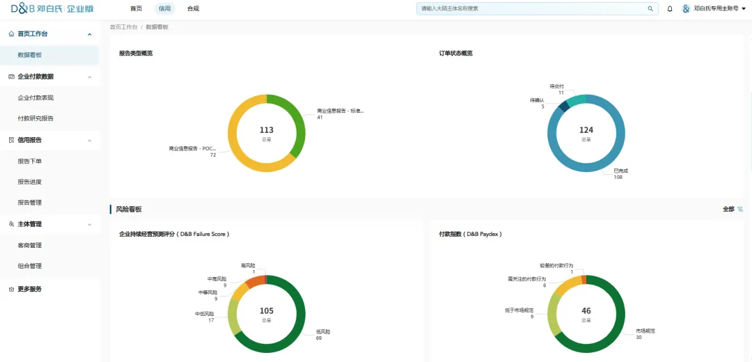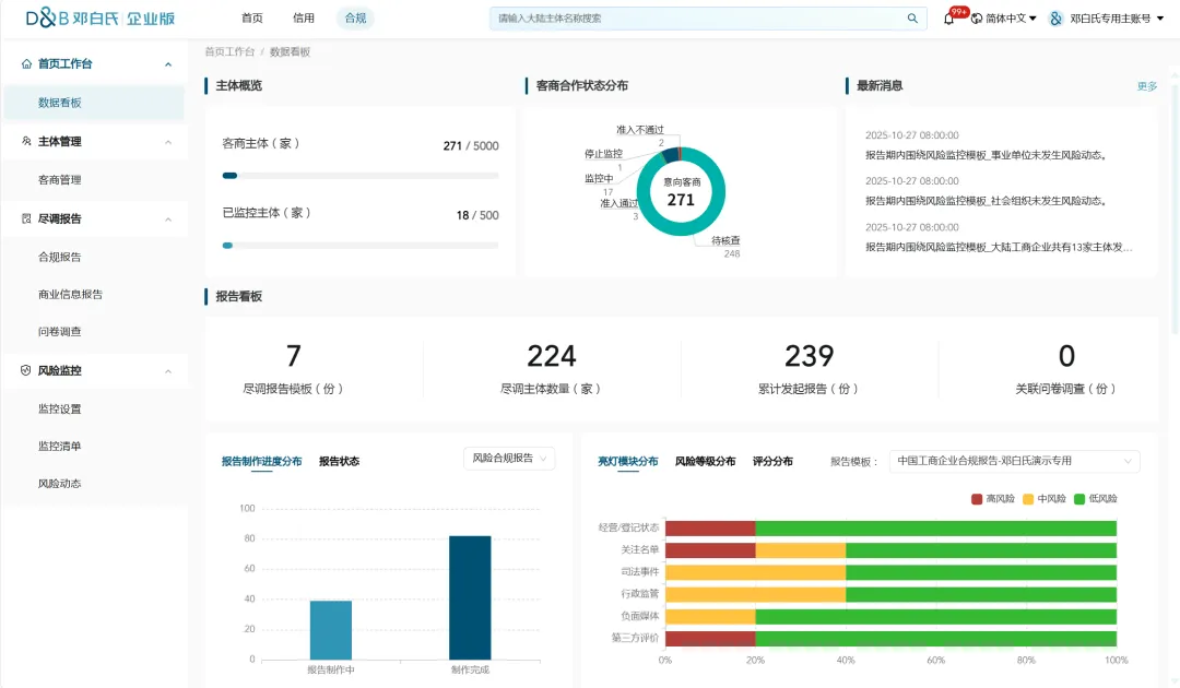 平台整合了包括工商信息、司法风险、经营状况、关联关系、主体评分等在内的多维度动态数据,并依托邓白氏全球评分体系,构建起科学、多维的风险评估模型。
