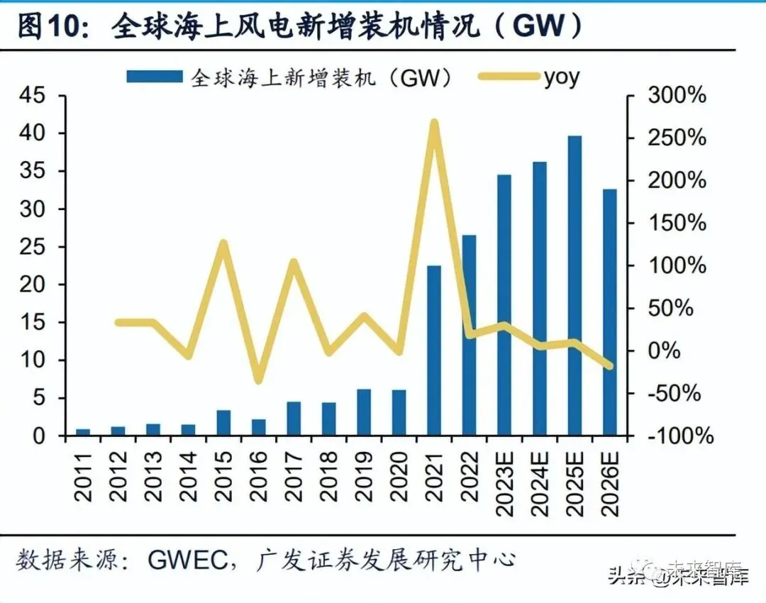 全球海上风电景气度高,各国政策加速海风发展。全球减碳和俄乌战争背景下, 全球风电规划确定性强,据GWEA数据,全球海上风电新增装机从2012年1.2GW增 长至2021年的22.5GW,年均增长率基本保持在20-30%之间。欧洲德国、丹麦、荷 兰、比利时四国“北海海上风电峰会”承诺2030年海风装机达65GW;欧洲8国签署 “马林堡宣言”,2030年将波罗的海地区海风装机容量从目前的2.8GW提高至19.6GW;英国《能源安全战略》将2030年海上风电目标从40GW提高至50GW;美国则计划 在2030年前新增海上风电装机30GW,其余亚太、南美地区起点低,发展快,我们 预计2022-2026年新增装机量CAGR可达37.83%,到2026年全球海上风电累计装机 容量将突破145GW,发展前景明朗。