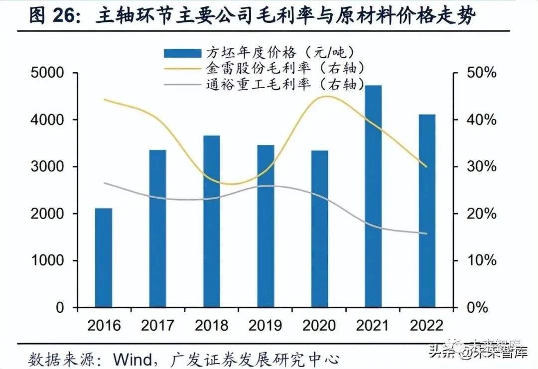 风机零部件环节盈利能力受原材料价格影响较大。对2016年至今的原材价格和 零部件环节毛利率的相关性进行分析,可以发现主要零部件环节代表公司毛利率水 平与当年主要原材料价格基本呈现负相关走势。以塔筒环节为例,其主要原料中厚 板价格由2021年的5453元/吨下降到了2022年的4698元/吨,下降幅度13.9%,随着 而来的,也是塔筒环节主要公司毛利率企稳,其中泰胜风能毛利率由16%上升到18%。截至2023年6月底,主要原材料铸铁/中厚板/玻璃纤维纱/铜价格已较22年高点下降 26%/19%/39%/10%。钢材等原材料价格回落将促进包含塔筒、铸件锻件等在内的 零部件环节盈利改善,我们预计零部件端盈利回升明显,静待23Q3整机端盈利修复。