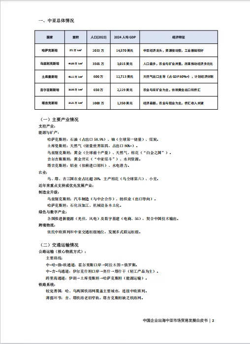 《2025 中国企业出海中亚市场贸易发展白皮书》系统梳理了中亚五国的市场环境、中企与各国双边贸易态势及市场开发实操指南,为中国企业出海中亚提供全面参考。