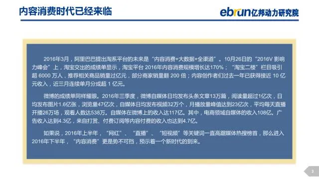 如果说,2016年上半年,“网红”、“直播”、“短视频”等关键词一直高踞媒体热搜榜首,那么进入2016年下半年,“内容消费”更是势不可挡,预示着一个新时代的到来。