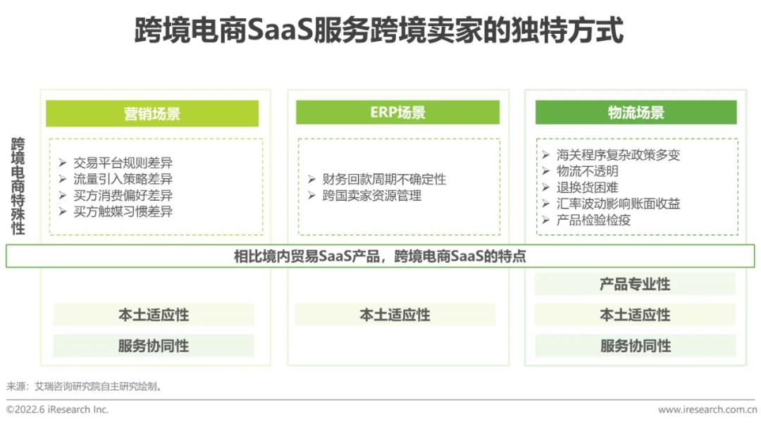 本土适应性、产品专业性和服务协同支撑起跨境电商的特殊性相比境内贸易SaaS,跨境电商SaaS的特点和优势体现在:(1)本土适应性:不同国家的买方的消费习惯、文化心理差异性大,因此跨境电商SaaS更需要具有本土适应性,能整合全球社交媒体、物流渠道和企业资源;(2)专业性:跨境支付结售汇、跨境物流报清关等,业务环节多,且易受政策影响,倒逼跨境电商SaaS构筑专业性壁垒;(3)服务协同:海外环境的信息差让跨境卖家无法直接使用工具型产品,跨境电商营销及供应链SaaS厂商多会在提供产品的同时叠加咨询服务,辅助卖家健康成长。
