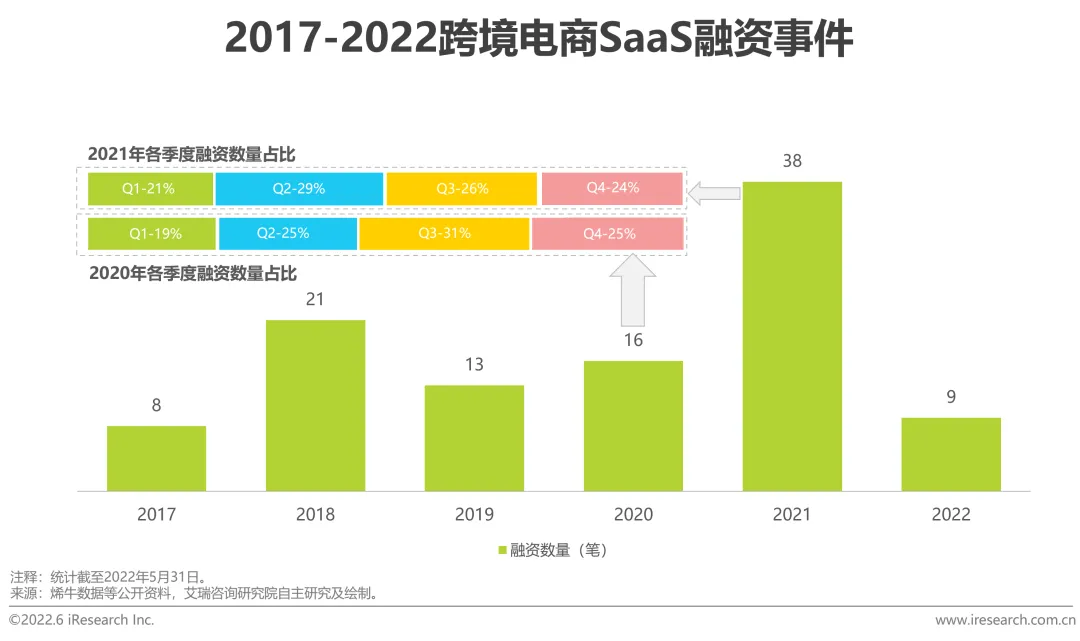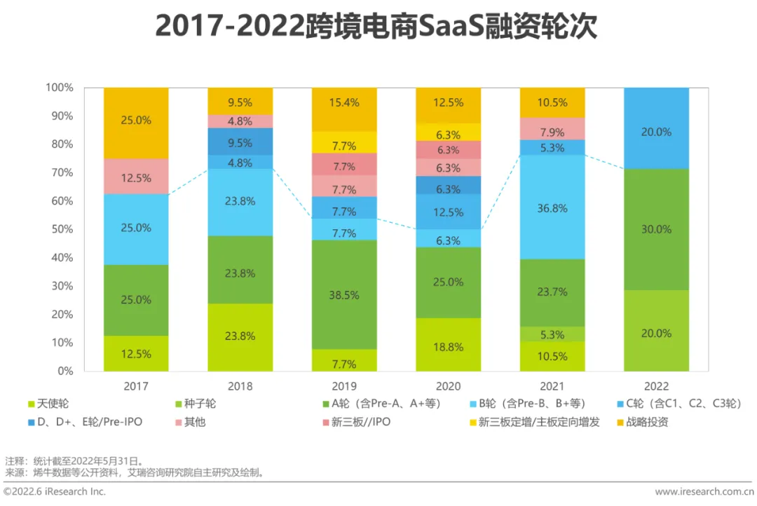 从融资数量上看,2018年跨境电商SaaS企业融资次数达到小高峰,受贸易战和金融危机的滞后影响,2019年投融资热度回缩。而后受疫情影响跨境电商进入红利期,2020年Q3开始跨境电商SaaS融资事件数激增,就2022年1-5月融资情况来看,跨境电商SaaS市场或将保留热度。从融资结构上看,B轮及以下融资轮次占比各年均近或过半数,融资对象主要是发展初期的企业。说明目前跨境电商SaaS整体呈年轻化,初创企业多且发展速度快。随着跨境电商企业对SaaS接受度提升,跨境电商SaaS在短期内将维持稳定的融资热度。