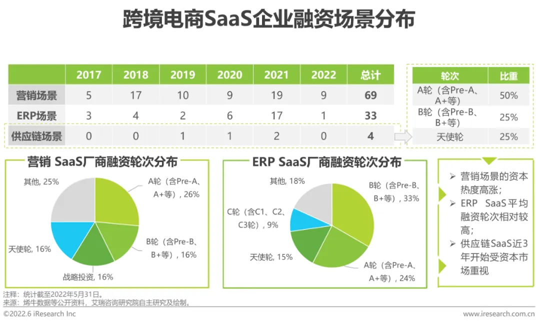 营销场景融资热度维持高位,资本偏好相对成熟的ERP SaaS厂商,供应链SaaS近3年开始受资本重视从细分场景上看2017至2022年上半年跨境电商SaaS的融资分布,呈现以下特点:(1)营销场景的投融资数量历年均居高位,是资本持续关注的赛道,也是初创企业的主要切入点;(2)ERP SaaS获投企业中,B轮融资占33%,资本偏好有一定规模和经营基础的SaaS厂商,赛道成熟度相对营销要高;(3)供应链SaaS从2019年开始受资本市场重视,赛道潜力尚未释放。