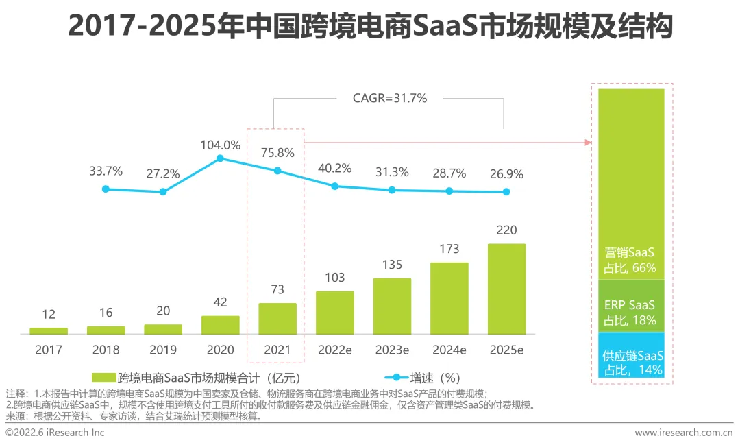 2020年Q3起,疫情为跨境电商带来新的生机,跨境电商SaaS也快速发展,规模增速一度高达104.0%。2021年中国跨境电商SaaS市场规模达73亿元,增速为75.8%。其中营销SaaS市场份额占比最高,约66%。2022年上半年,在疫情反复、运价高位、海外通胀等背景下,跨境电商发展短期停滞,跨境电商SaaS的增速也随之放缓。其中供应链和ERP SaaS受影响较大,营销SaaS仍维持较高增速。随着跨境电商营销SaaS功能的完善和供应链SaaS渗透加深,预计未来4年跨境电商将以31.7%的复合增速增长。