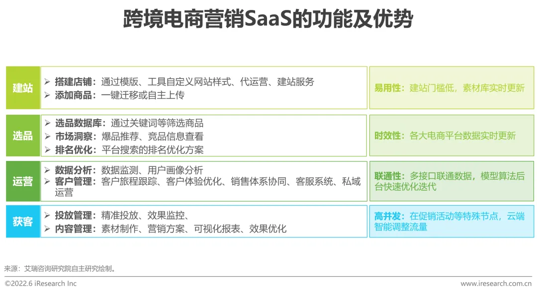 分别满足卖家从建站到引流获客的需求,实现从0到1蜕变根据产品功能可将跨境营销SaaS分为建站、选品、运营、获客四类,覆盖跨境卖家从“0”到“1”的各种营销需求:(1)建站是独立站卖家的基础需求,功能相对成熟和标准化,延伸出平台属性,衔接代投广告、内容审核等功能;(2)选品SaaS以亚马逊平台为基础,主要为平台型卖家提供数据服务;(3)运营SaaS整合多渠道数据,形成用户画像辅助潜客挖掘和二次销售,将服务贯穿于整个客户旅程并赋能获客环节;(4)获客SaaS辅助卖家通过社媒渠道触达客户,并汇总多渠道活动数据,帮助卖家优化获客形式,与运营形成业务闭环。当前跨境卖家对品牌建设和营销的需求呈现碎片化特点,跨境营销SaaS产品以其易用性、时效性、联通性和高并发等优势,充分适应跨境卖家的精细化运营和快速迭代的需求。