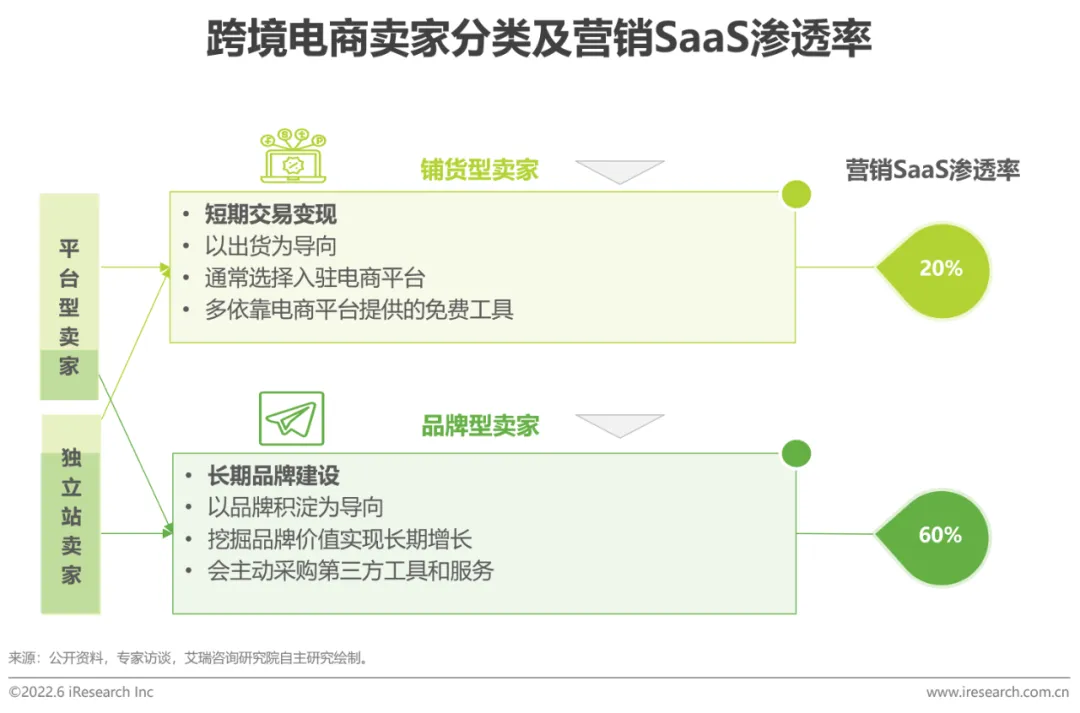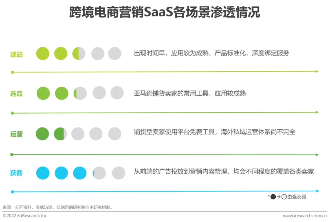 视角1:目标客户群体。根据跨境电商卖家的战略定位不同可分为铺货型卖家与品牌型卖家,其中品牌型卖家以长期增长和建立品牌价值为导向,会主动接触并尝试功能更丰富的SaaS工具和增值服务,因此品牌型卖家是营销SaaS的目标客群。视角2:细分场景。(1)建站SaaS以其低门槛和易用性的优势早早渗透进跨境卖家,厂商提供建站产品的同时会提供建站咨询服务,因此发展较成熟。(2)虽然现阶段存在平台型卖家向独立站转型的大趋势,但目前中国卖家主要集中在亚马逊平台,因此选品SaaS作为亚马逊平台铺货卖家的刚需工具的应用渗透也较高。(3)当前海外尚未形成完整的私域运营体系,因此运营SaaS的应用较少,但品牌卖家增加的趋势下,应用增长空间乐观。(4)获客SaaS基于效果或流量收费的模式,在TikTok等社交类平台热度提升、海外社交媒体趋于多元化的背景下能帮助卖家灵活引流并直接转化,最受重视且渗透率最高。