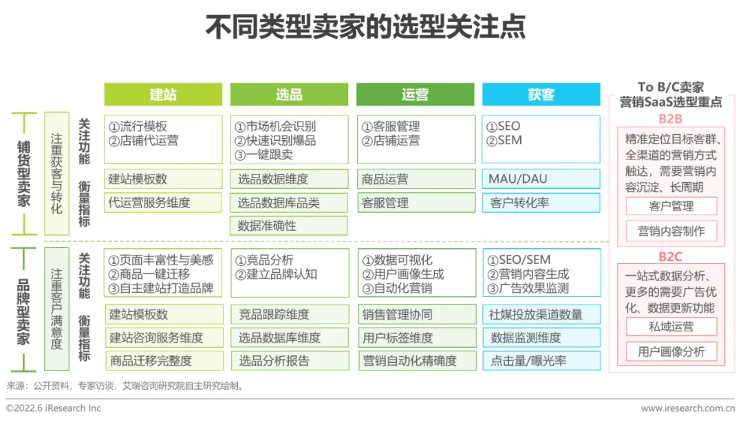 铺货型卖家重热点跟踪能力,品牌型卖家重内容沉淀深度铺货型卖家选型时以提高转化率为导向,在建站和选品时需要跟踪爆款一键复制页面或跟卖。同时在获客环节,着重考量产品带来的转化效果。品牌型卖家在营销产品选型时更关注产品对客户满意度提升和品牌价值提升的能力,因此需要着重考量SaaS产品的数据监测与分析精准度,以衡量品牌传播效果。此外,B2B与B2C卖家由于获客周期与渠道不同,在选型上也有不同侧重。B2B卖家需要花更长时间进行内容营销与客户管理,在选型时要关注运营和获客SaaS的内容生产功能;B2C卖家多通过社媒渠道触达客户,选型重心应放在私域运营与广告效果反馈。
