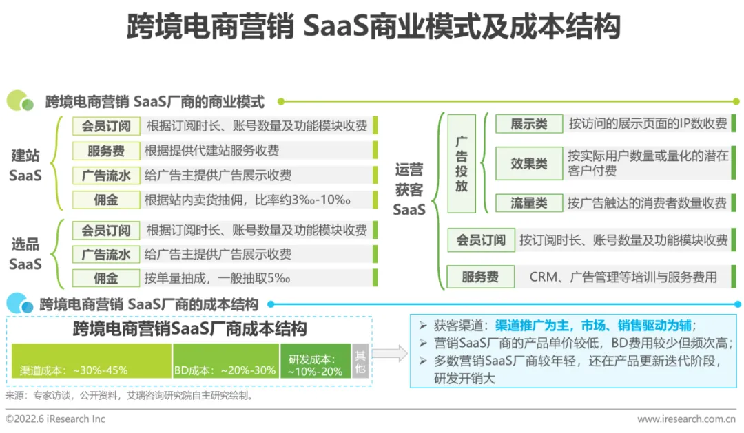 交易型SaaS的典型场景,流量付费与效果付费模式深度应用跨境营销与交易环节直接挂钩,是“交易型+SaaS”充分应用的典型场景。因此厂商可以将产品价值通过卖家的交易数据进行量化,推行交易额抽佣、流量分成等收费模式。例如广告投放场景,收费模式可以根据给卖家带来直接的用户转化效果,或者展示次数、触达数量等可量化指标。此外,卖家对建站和运营获客的运用不够成熟,对买家消费倾向和触媒习惯缺乏认知,因此衍生出咨询服务费和代运营服务费,进一步延伸业务触角。跨境营销还需要厂商与电商平台和社交媒体等流量平台深度合作,因此跨境营销SaaS厂商的成本中,渠道成本约占30%-45%。随着厂商与流量平台间长期合作关系转变为资源置换的战略关系,渠道成本压力得到缓解,盈利潜力得以释放。