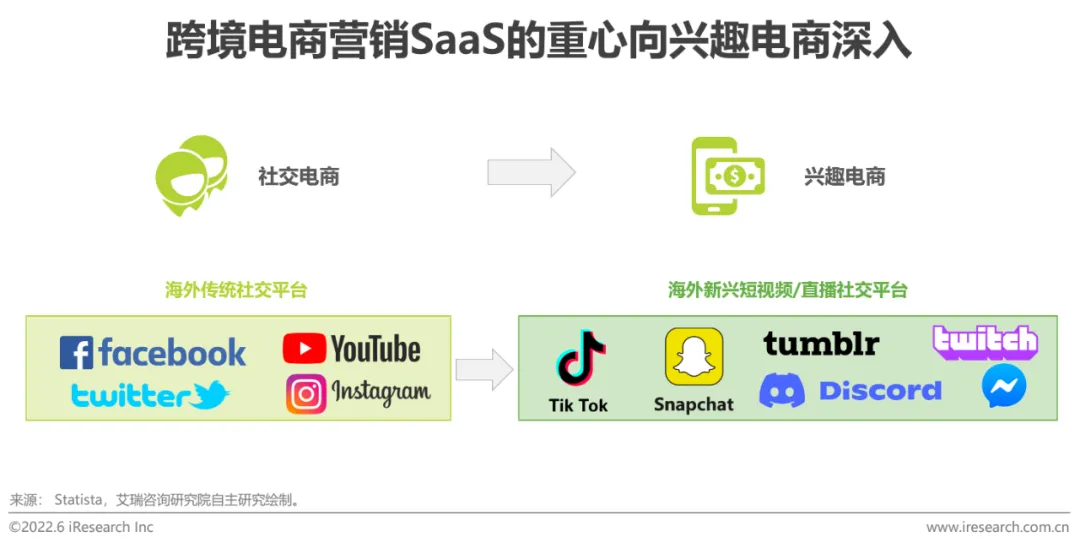 跨境电商营销SaaS按功能分为建站、选品、运营和获客四类。目前营销SaaS的初创企业多,产品与服务捆绑度高,且“SaaS+交易”的商业模式在营销类SaaS中深度应用。随着买家触媒习惯的变化,其功能重心也从传统广告向网红、直播营销和短视频转移。