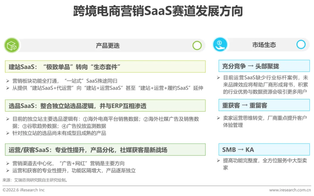 由“极致单品”转向“生态套件”,做卖家精细化运营的推手当下跨境头部电商平台流量拥挤,客户转化难度加大,因此去中心化的私域流量运营的模式仍是未来卖家的主要竞争方式。数字化背景下,高效调动底层技术、挖掘数据价值、赋能流量收割将成为卖家竞争的核心。面对未来的需求变化,建站和选品自身功能拓展有限,会更多的向客户管理、数据管理、推广获客等功能打通,而运营与获客的功能会更加专业化,其发展重心也会向社交营销方向倾斜。