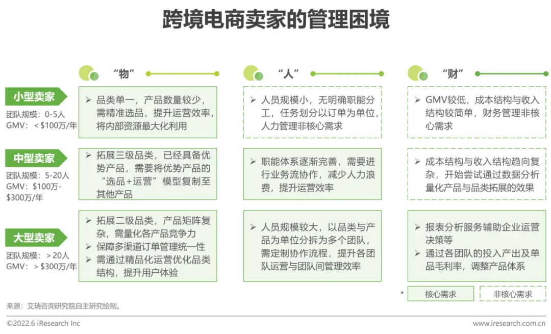 “物” “人” “财” 管理复杂度伴随卖家规模增长而上升企业资源管理为卖家对内的核心管理工作,围绕“物”、“人”、“财”展开,因此卖家在企业资源管理上的痛点差异来源于卖家自身规模的差异。小型卖家的人员规模与GMV均较低,产品数量较少,核心痛点在于内部资源效益最大化;中型卖家基于优势产品形成一定规模,期望将优势产品选品、运营、团队管理的经验复制至其他产品,并分析复制的有效性;大型卖家庞大的产品体系之下,面临多渠道订单管理混乱、团队协作效率较低等问题,其核心需求在于规范企业运营流程,提高整体运营效率,以节约综合管理成本。