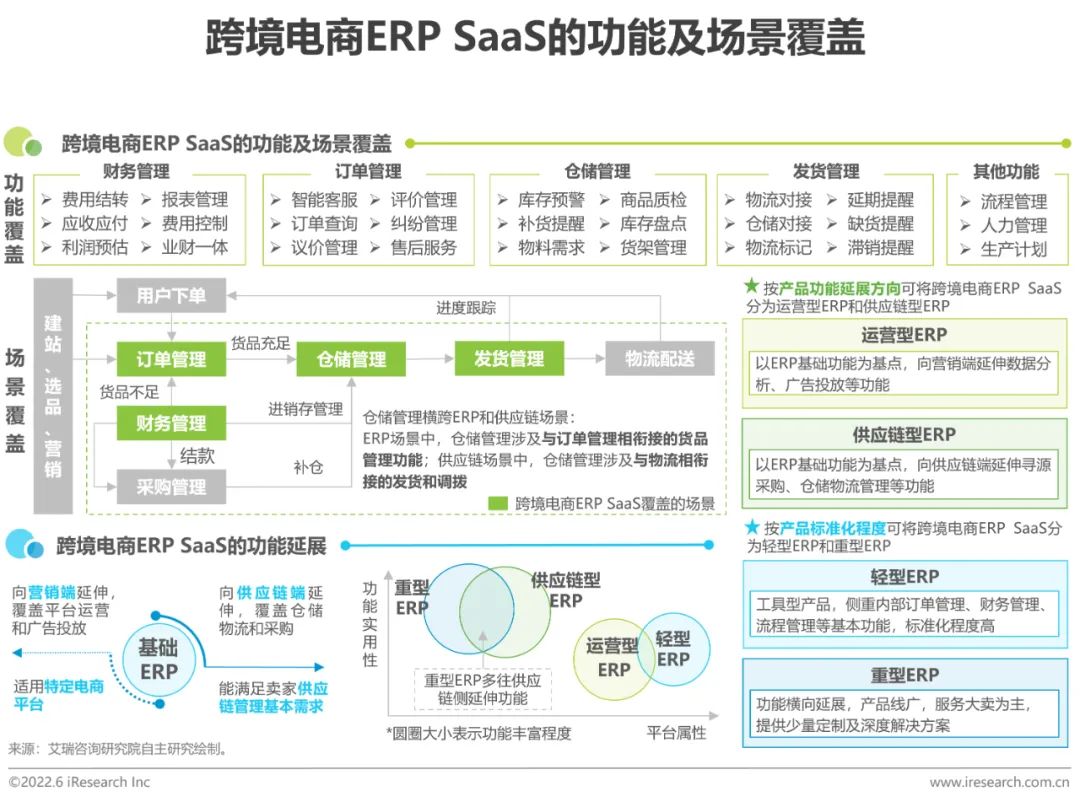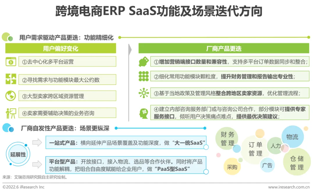 提升单模块专业性,同时利用延展性做大场景或解耦功能模块跨境电商ERP SaaS的迭代受用户需求变化和厂商自驱力两方面影响:(1)用户驱动功能革新:跨境卖家的前端营销正从离散经营向品牌化经营转变,管理模式也从粗放式管理向精细化运营转变。因此,厂商对产品功能迭代也朝着功能精细化的方向演进,如增加营销平台兼容性、优化报表模型和分析精准度等;(2)厂商自发性产品迭代:厂商正发挥ERP SaaS的连接性和延展性,横向拓展产品功能,打造一站式产品或平台型产品,满足用户跨境营销管理全链路需求。