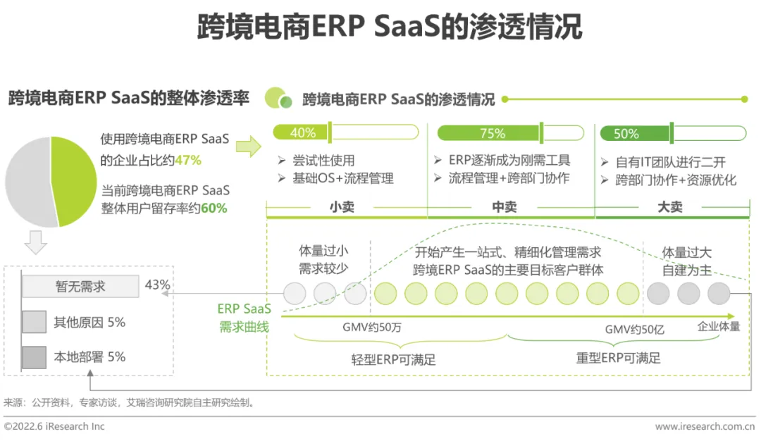 卖家对ERP SaaS的需求近似右偏正态分布,整体渗透率约47%ERP作为企业内部资源协调中台,卖家对其接受度较营销SaaS和供应链SaaS更高,SaaS化发展也相对成熟,目前跨境电商ERP SaaS整体渗透率约47%。其中,中卖是跨境电商ERP SaaS厂商的主要客群。由于中卖多处于规模快速扩张的阶段,需要及时对企业内资源周转进行优化和调整,而电商平台内置的简易订单管理系统和传统表单管理形式难以承载资源动态变化和体量扩张带来的需求变动,因此对ERP有刚需,渗透率约75%。随着中卖规模继续扩张至大卖阶段,对ERP仍有刚性需求,但本地部署和定制的比例会越来越高。整体上看,跨境电商卖家对ERP SaaS的需求近似向左倾斜的抛物线。